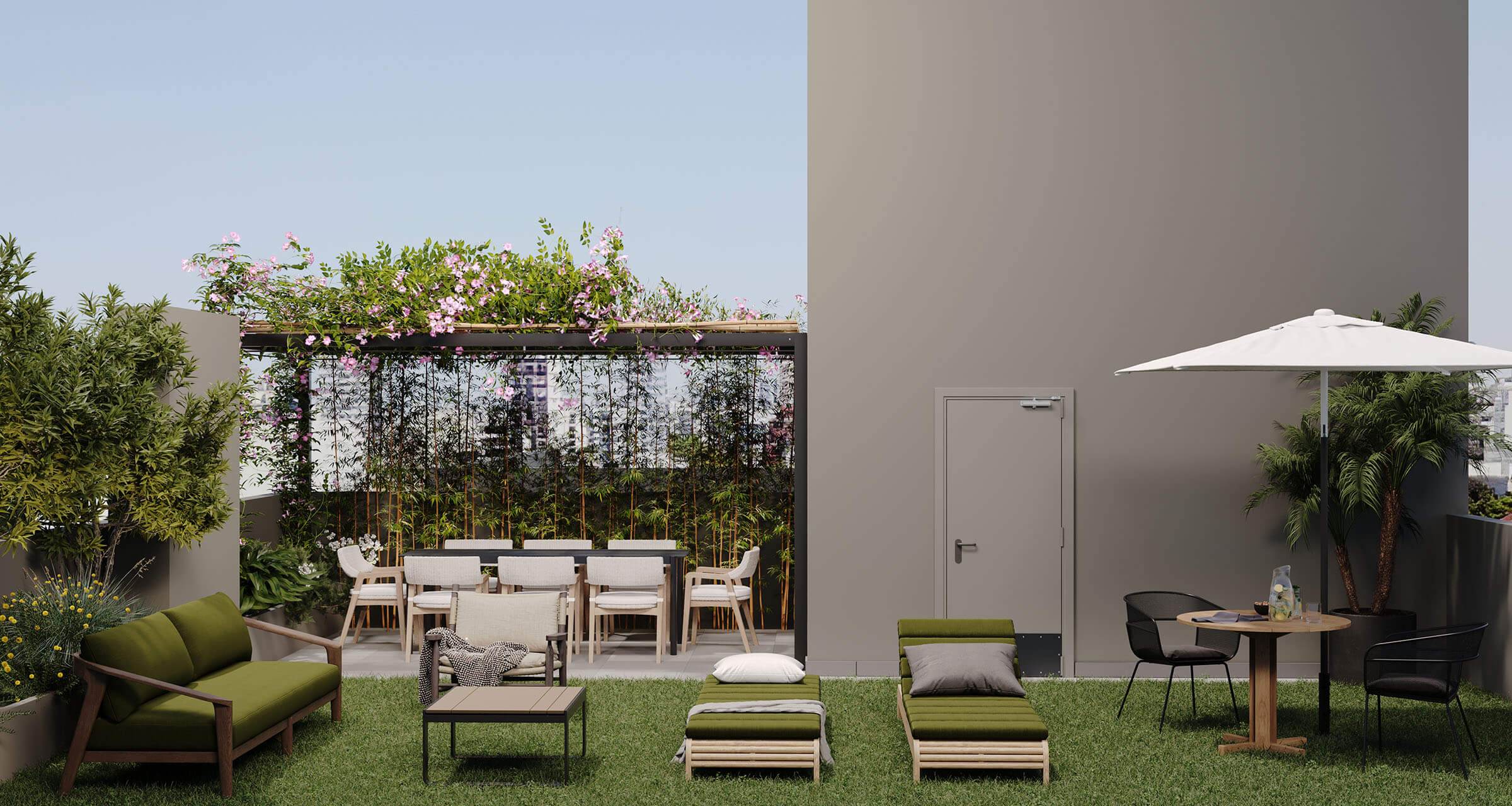 Espacios en armonía con la naturaleza, terrazas verdes y suelos absorbentes que cuidan el planeta y brindan espacios para el bienestar.